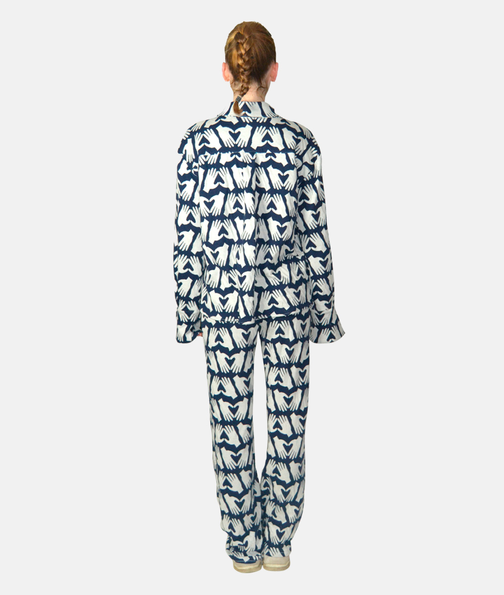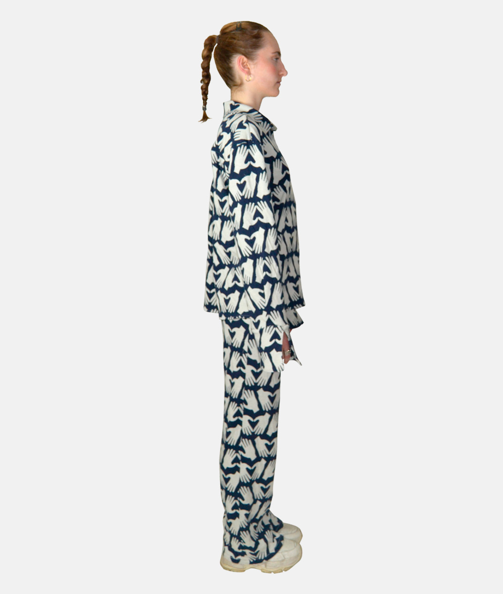 Chemise en jersey jacquard double face à imprimé graphique bicolore bleu et blanc. Le motif répétitif couvre l’ensemble de la pièce. Col classique avec pied de col, fermeture par boutons, manches longues droites terminées par un empiècement fendu aux poignets. La coupe ample assure un tombé fluide.