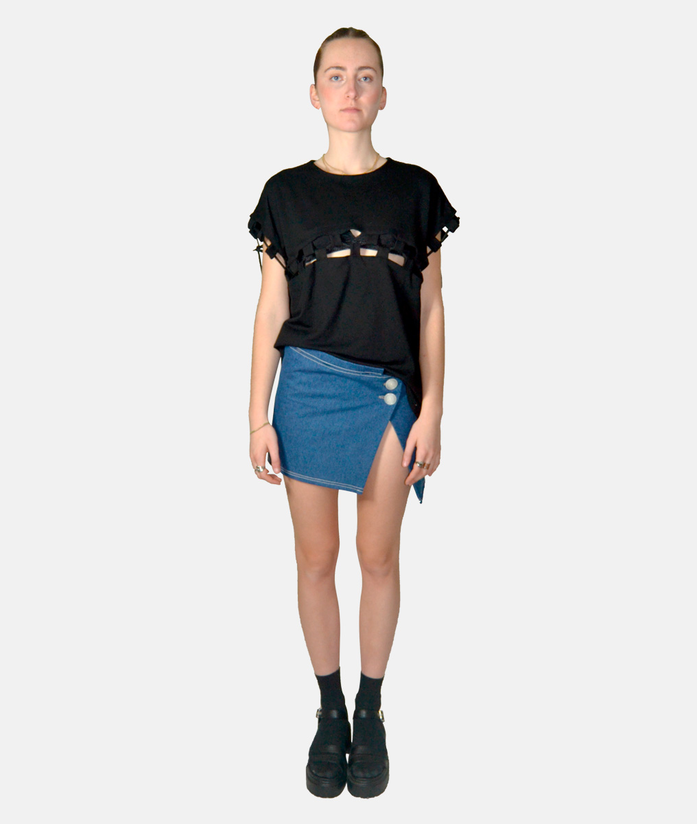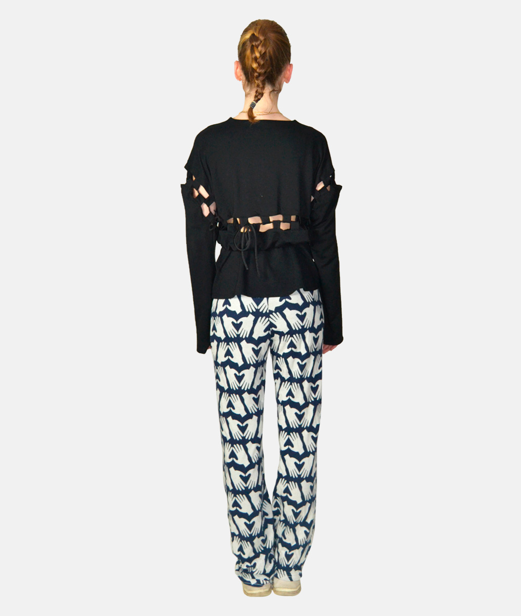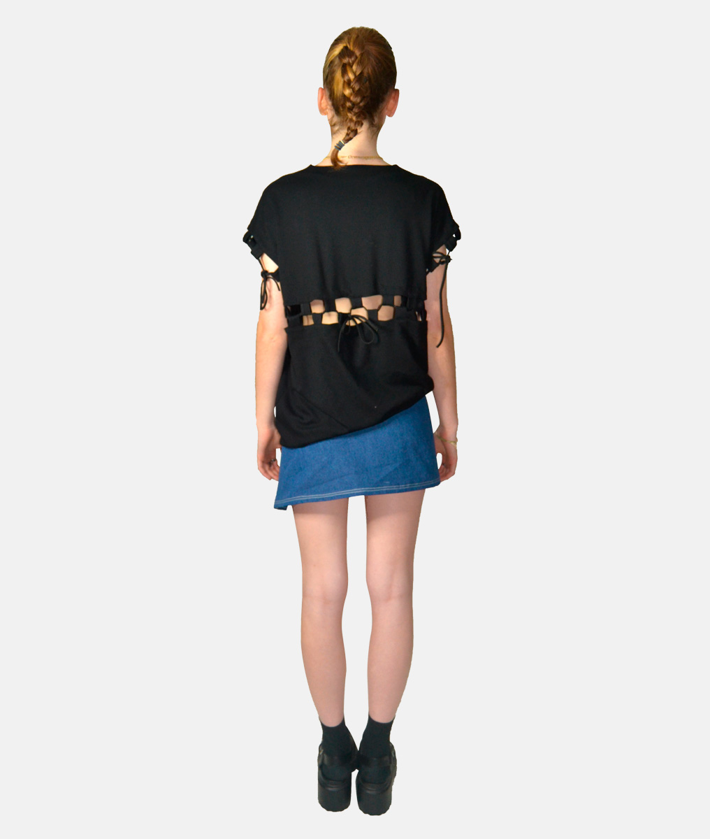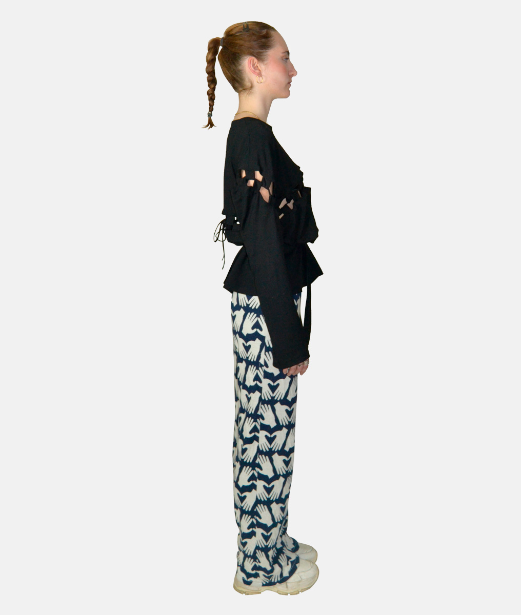 Haut noir ample à découpes aux épaules et sous la poitrine, avec emmanchures tombantes et col rond. Les manches se détachent entièrement grâce à un système de liens, offrant trois configurations : manches longues, sans manches, ou uniquement les manches. Le système de liens permet également d’ajuster les ouvertures aux épaules et à la poitrine.